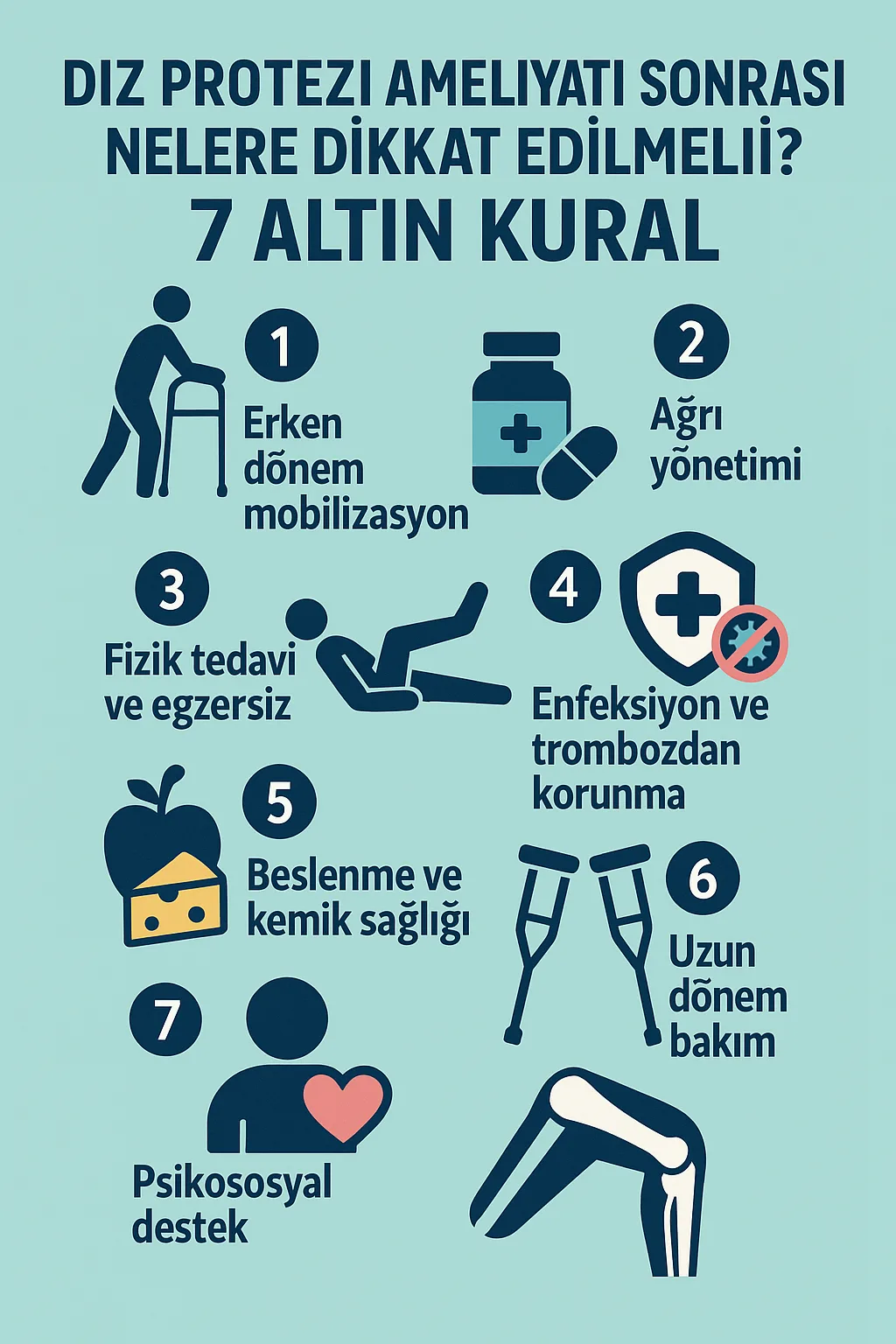 Diz protezi ameliyatı, ileri eklem hasarına kalıcı bir çözüm sunarken ameliyat sonrası yönetim—erken mobilizasyon, ağrı kontrolü, sistematik fizik tedavi, enfeksiyon ve tromboz önlemleri, dengeli beslenme, uzun dönem bakım ve psikososyal destek—başarının anahtarını oluşturur. “7 Altın Kural”ı yaşam tarzınızın ayrılmaz parçası haline getirerek, protezin fonksiyonel ömrünü maksimize eder, bağımsız hareket kabiliyetinizi korur ve aktif, ağrısız bir hayata dönüş yolculuğunuzu güvenle sürdürebilirsiniz.