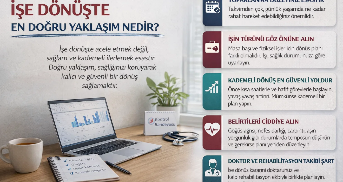 İşe dönüş kararını yalnızca hastanın isteği belirlememelidir. Doktor kontrolü, kontrollerde elde edilen bulgular ve varsa kalp rehabilitasyon ekibinin değerlendirmesi sürecin merkezinde olmalıdır. Rehabilitasyon, hastanın güvenli biçimde hareket kapasitesini artırmasına ve günlük yaşama daha bilinçli dönmesine yardımcı olur. Bu nedenle en doğru yaklaşım, “kendimi fena hissetmiyorum, döneyim” düşüncesi değil; “doktor ve takip ekibiyle uyumlu biçimde, bedenimin gerçek durumuna göre döneyim” anlayışıdır. Bu fark küçümsenecek bir fark değildir. Çünkü yanlış hız, doğru iyileşmeyi bozabilir.