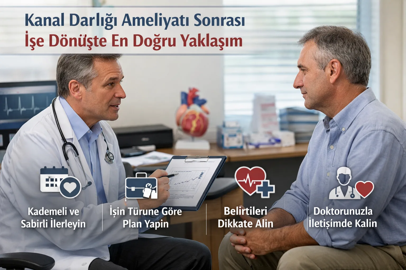 Kanal Darlığı Ameliyatı Sonrası İşe Dönüş : kanal darlığı ameliyatı sonrası işe dönüşte en doğru yaklaşım, bir sabah ansızın eski tempoya dönmek değildir. Kalp ameliyatı geçiren hastada asıl amaç, işe ne kadar çabuk başlandığı değil; işe başladıktan sonra bunun sağlık bozulmadan sürdürülebilip sürdürülemediğidir. Bu nedenle kademeli işe dönüş planı, ameliyat sonrası toparlanmanın en akıllı ve en güvenli parçalarından biridir. Kişi kendini biraz toparlamış hissedebilir, günlük basit işlerini yapmaya başlamış olabilir ve psikolojik olarak da yeniden üretken olmak isteyebilir. Ancak bu istek tek başına yeterli değildir. Vücudun kaldırabildiği yük ile kişinin dönmek istediği tempo aynı şey değildir. İşte kademeli plan tam bu ayrımı doğru kurmak için gerekir.